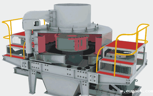 把物料从进料斗加入制砂机,经分料器分成两部分,一部分由分料器中间进入高速旋转的叶轮中,在叶轮内被迅速加速,然后快速从叶轮三个均布的流道内抛射出去,先同由分料器四周自收落下的一部分物料冲击破碎,然后一起冲击到涡支腔内物料衬层上,被物料衬层反弹,斜向上冲击到涡动腔的顶部,又改变其运动方向,偏转向下运动,从叶轮流道发射出来的物料形成连续的物料幕。物料在涡动破碎腔内受到两次或多次机率撞击、摩擦和研磨破碎作用。被破碎的物料由下部排料口排出。